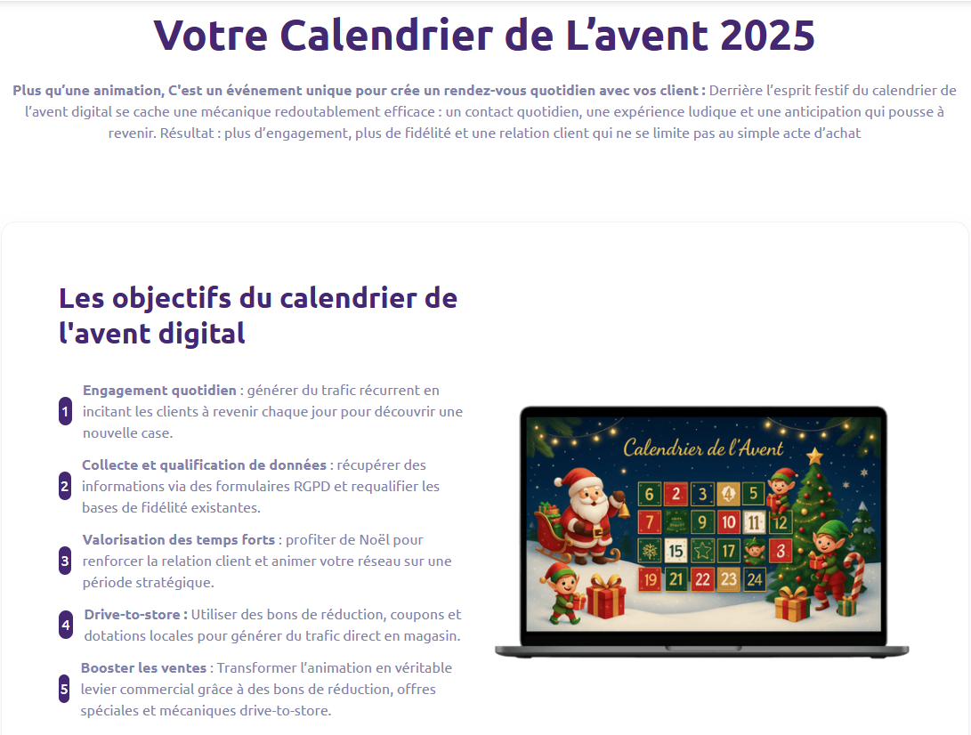 En reliant le digital au physique, le calendrier devient une passerelle efficace entre l’engagement en ligne et la fréquentation réelle de vos magasins.